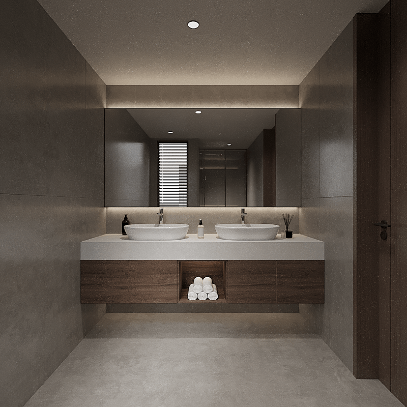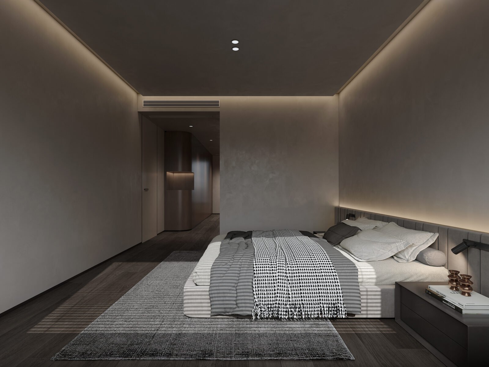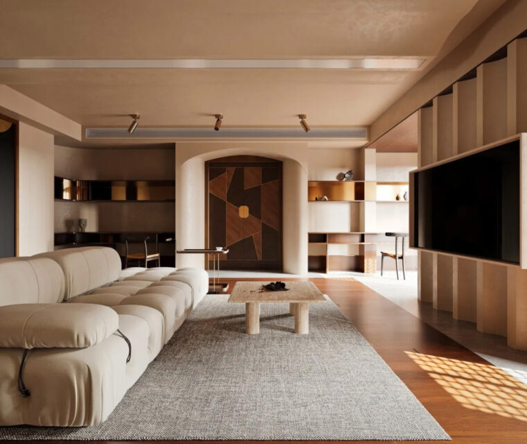 This large, flat-layer residence, which fuses the Bauhaus and micro-cement styles, showcases a modern and sophisticated living space through its minimalist aesthetic and bold lines. The base color scheme of beige and dark oak not only creates a sedate and elegant ambiance but also cleverly incorporates touches of green and red to add vibrancy and highlights to the entire space, making the living environment both simple and stylish.