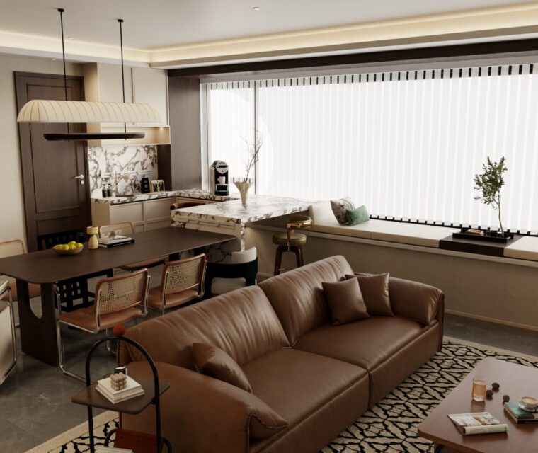 开放式厨房设计,尤其是配备电磁炉的大型中岛,不仅满足了现代家庭对西式烹饪的需求,还通过巧妙安装的升降式油烟机保持了空间的整洁有序。中岛同时兼作餐桌,让每一次家庭晚餐都充满仪式感与温馨。整个大通间还作为接待区,配备了咖啡吧和酒柜,设计旨在让未来的房主享受威士忌、红酒和雪茄的时光。